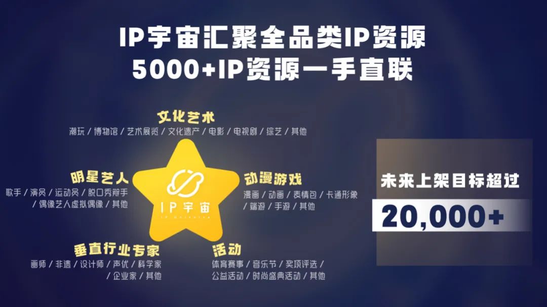 IP宇宙平台历时2年筹备,旨在为品牌客户提供一站式的IP营销解决方案。现IP宇宙平台有一手可合作IP资源超过5000个,包括明星艺人、文化艺术、动漫游戏、垂直行业专家、活动五大类型,会持续上架IP超过20000个,IP宇宙目标是成为中国最大的IP营销服务平台。