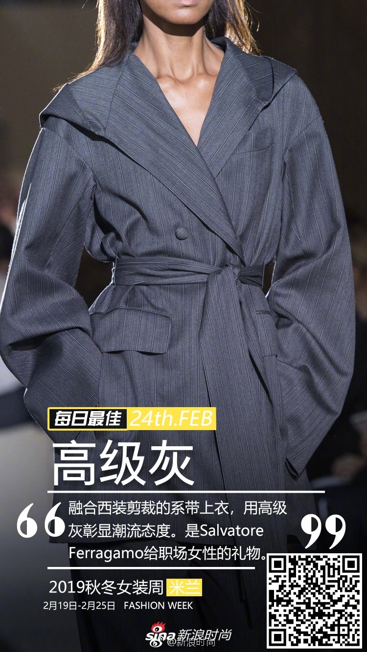 得票率:12.82% 高级灰在时尚界永不过时,本季的Salvatore Ferragamo优雅中带着霸道女神的气场,融合西装裁剪的系带上衣,流畅的线条透出品牌优雅的经典风格,用高级灰彰显潮流态度。是Salvatore Ferragamo给职场女性的礼物。 Salvatore Ferragamo 2019秋冬系列