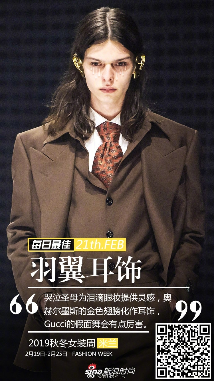 得票率:5.98% Gucci 2019秋冬大秀可谓是赚足了眼球,本次大秀主题为“多重面具,可见与不可见之界”。哭泣圣母为泪滴眼妆提供灵感,奥赫尔墨斯的金色翅膀化作耳饰,Gucci的假面舞会有点厉害。 奥赫尔墨斯的神话形象