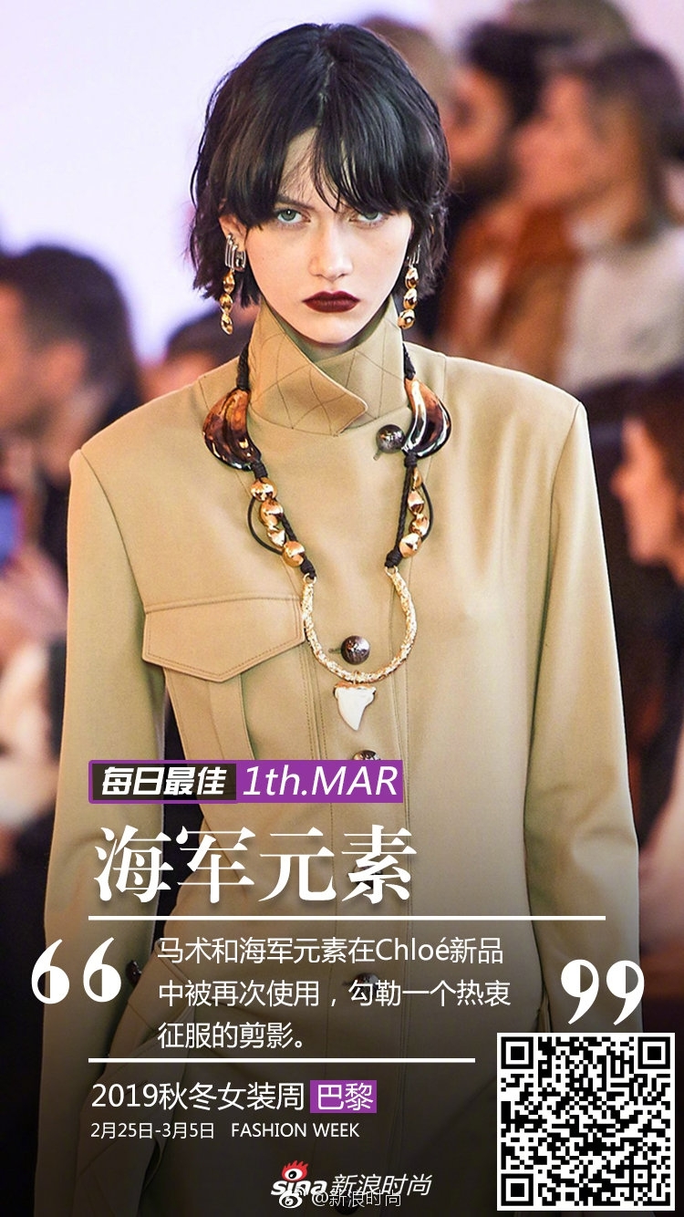 得票率:7.69% Chloé 2019年秋冬系列开启了一段独属秋冬季的环球旅行,马术和海军元素融入本系列中,赋予了新的生机与活力,色彩多变鲜艳,为沉闷的秋冬带来更多色彩。本季以锁为设计元素的手袋十分特别,几乎充斥整场大秀,实用又超酷! Chloé 2019秋冬系列