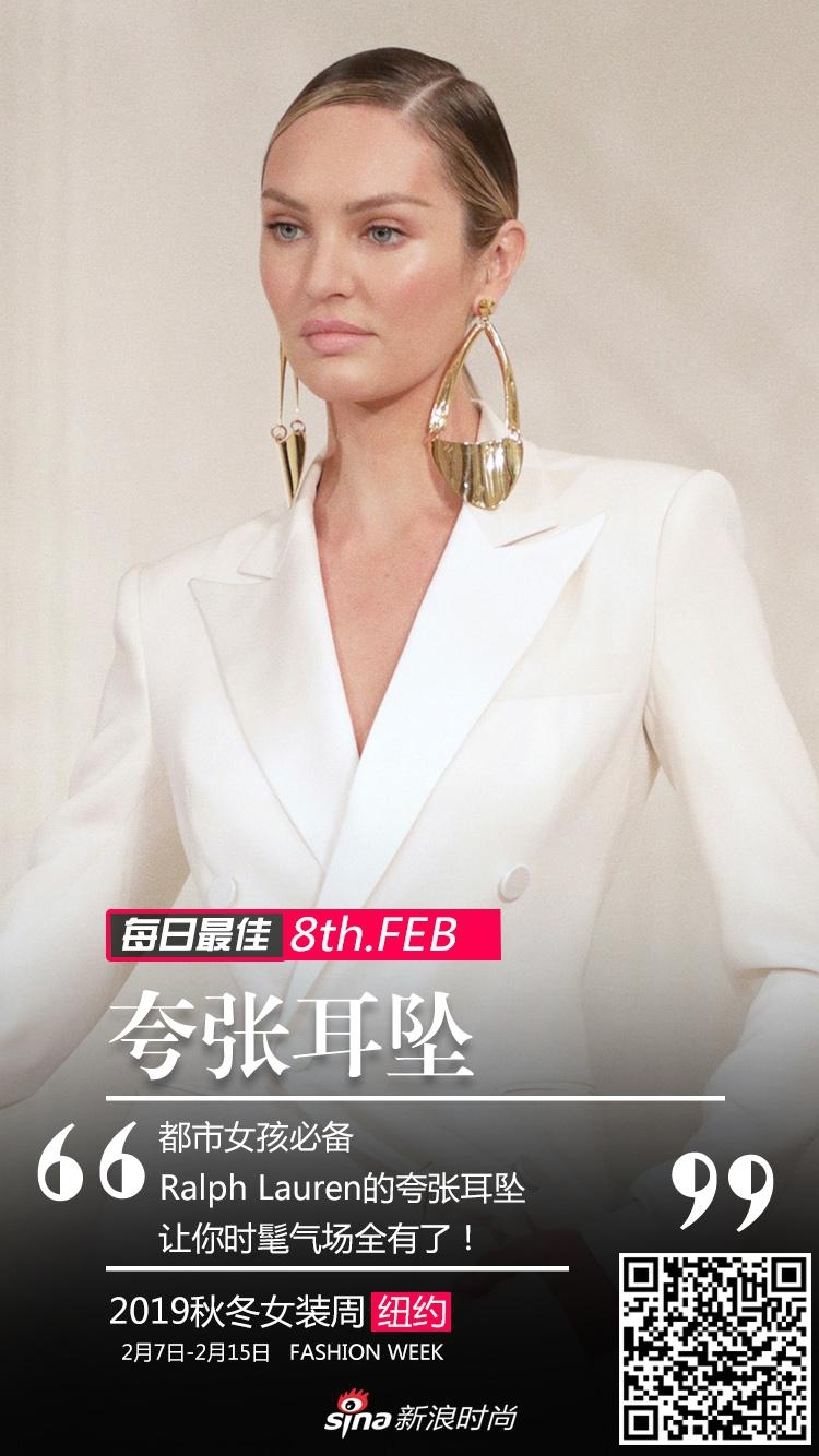得票率:6.84% Ralph Lauren 2019春夏系列以黑白金为整体主色调,简单的造型,加入夸张的耳坠搭配,打造美式优雅性感格调,让你时髦气场全有了。 Ralph Lauren 2019春夏系列